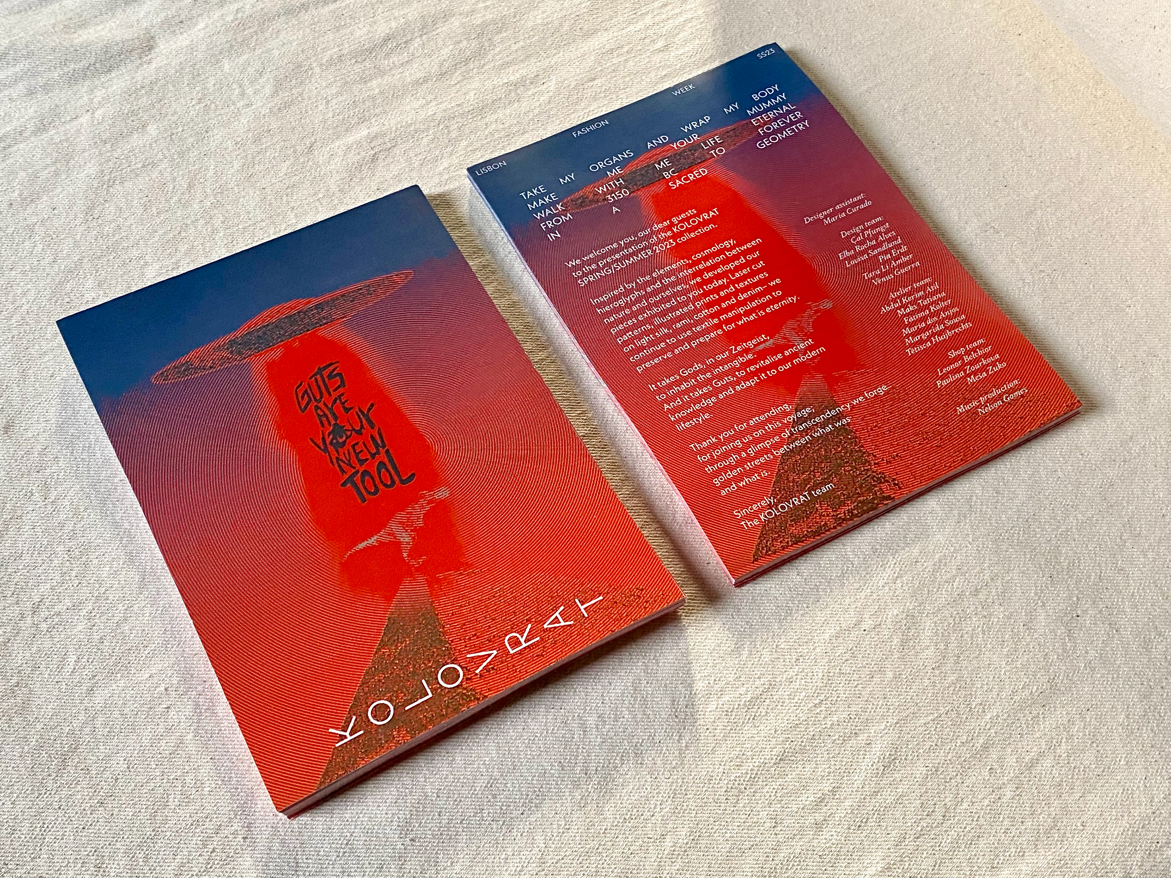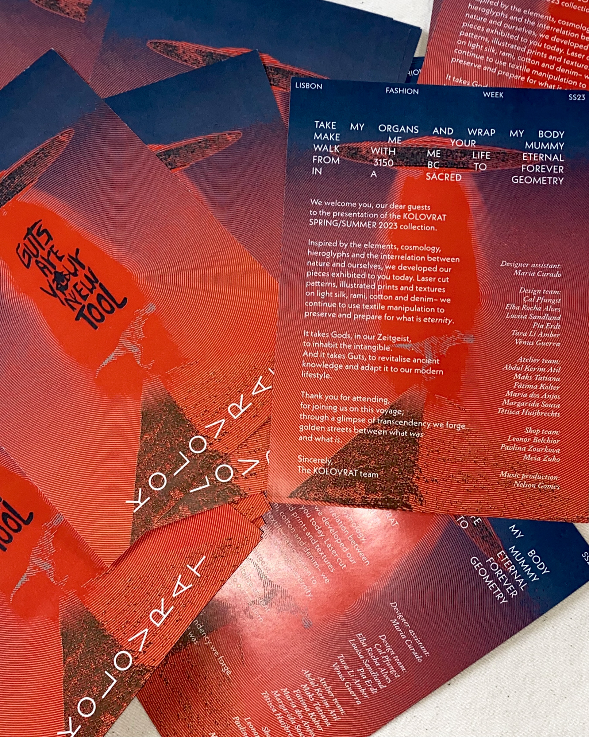 Graphic design, print design, content creation, copywriting, image editing for Kolovrat's Spring/Summer 2023 collection 'Guts are Your New Tool'. VIdeo created for the opening of Lisbon Fashion Week.